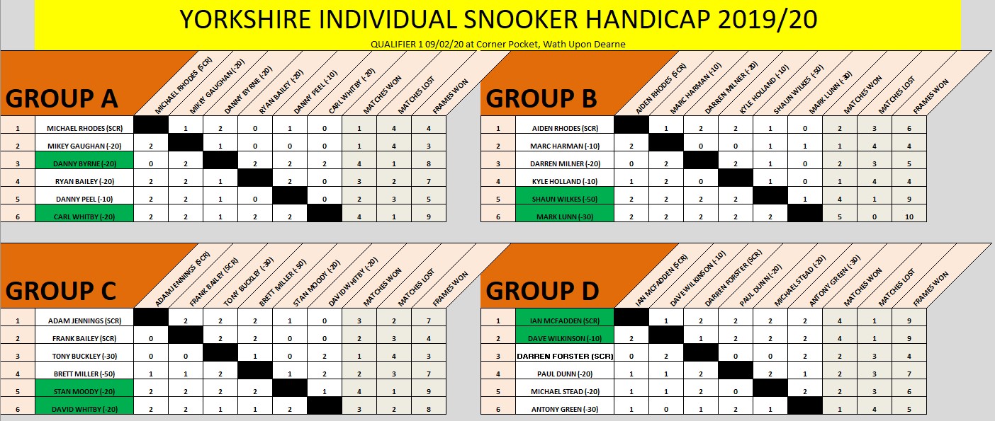 Mark Lunn made a break of 100 at the Pockets Snooker Bar in Rotherham during event one of the Yorkshire Snooker Handicap where his 100 percent record saw him through to the finals day on 29th March at the same venue. He will be joined by U16s Champion Stan Moody, Shaun Wilkes, Danny Byrne, brothers Carl and David Whitby, Ian McFadden and Dave Wilkinson.