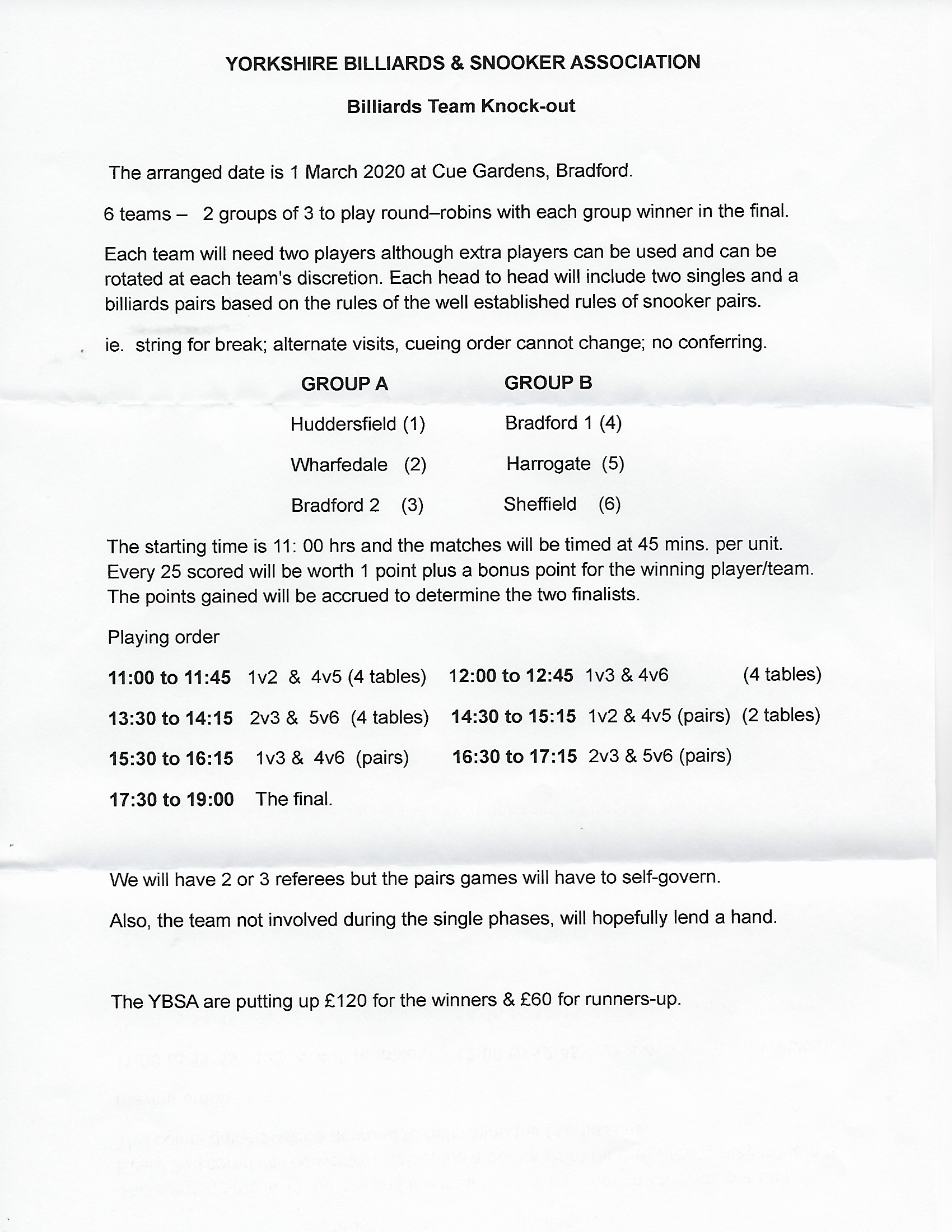 This will now take place on Sunday 1st March at Cue Gardens in Bradford, with teams being made up of 2 players, played in 2 groups of 3 teams with the winner of each group making the final. Matches will be 45 minutes long and teams competing will be 2 from Bradford, Harrogate, Huddersfield, Sheffield and Wharfedale.