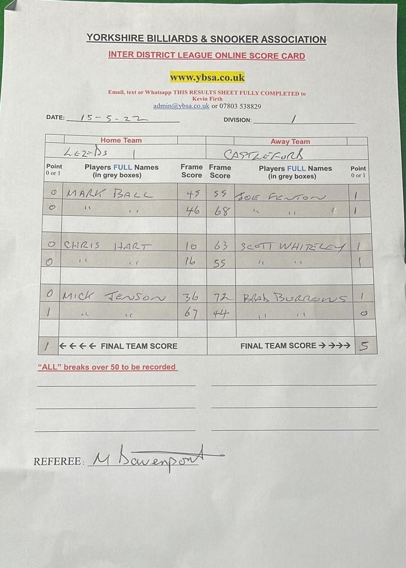 | 14th May 2022 | 7:30 pm | Division One | 2021/22 | Fixture 9 |