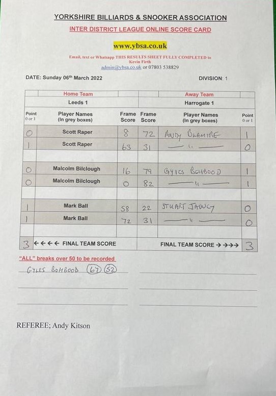 | 5th March 2022 | 7:30 pm | Division One | 2021/22 | Fixture 4 | Gyles Behbood |